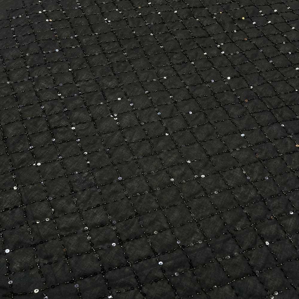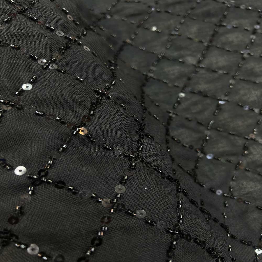 تم تزيين القماش بنقوش هندسية على شكل (مربعات/معينات) يدوية الصنع، باستخدام خرز الكسر اللامع وحبات الترتر الدقيقة التي تعكس الضوء مع كل حركة، مما يمنح التصميم عمقاً وفخامة استثنائية باللون الأسود الملكي.